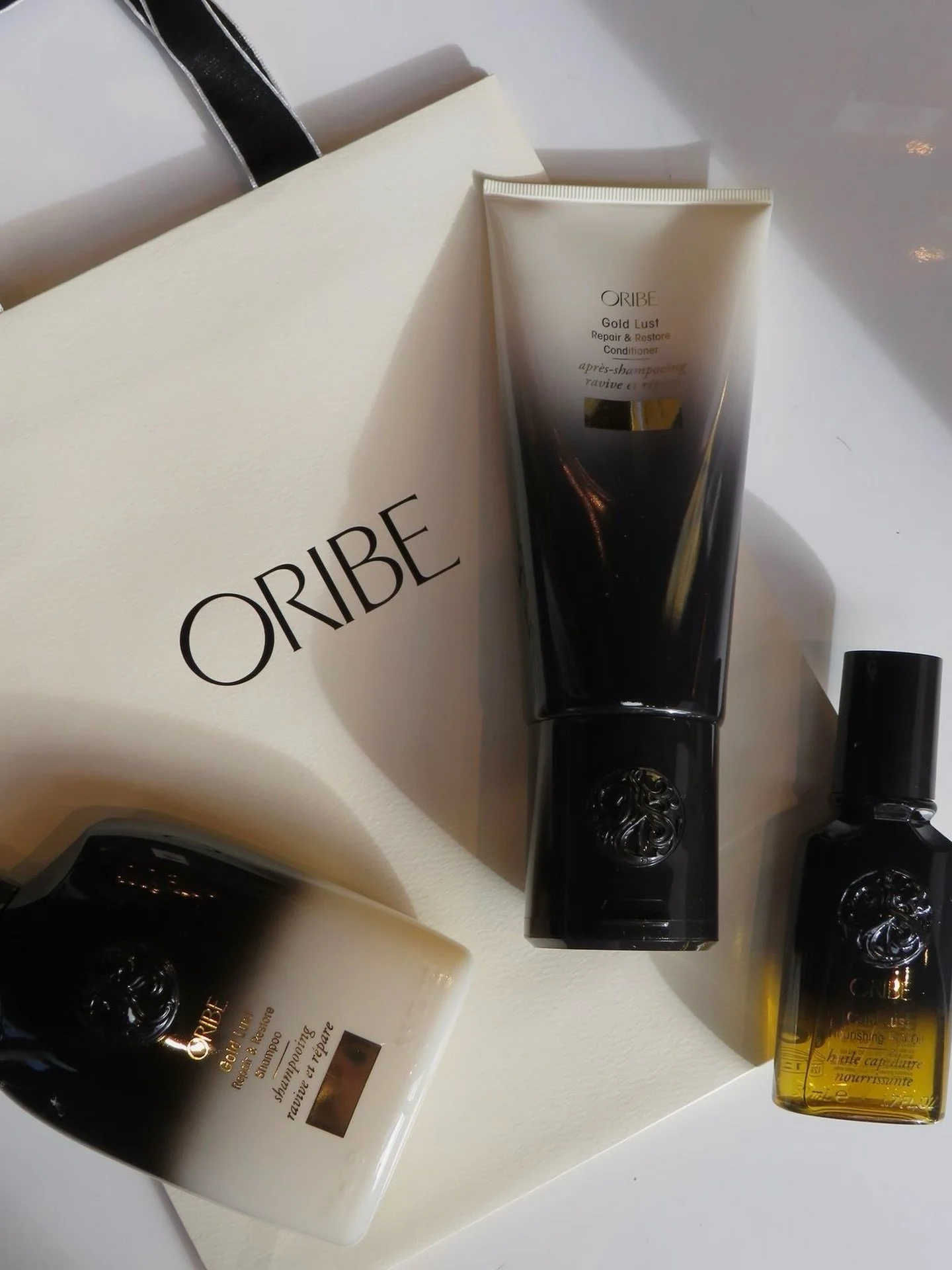 A collection of Oribe hair care products including shampoos, conditioners, and styling sprays arranged on a white surface.